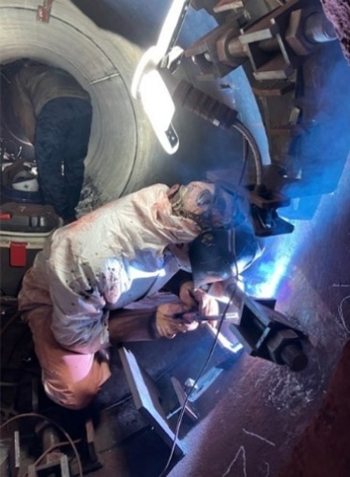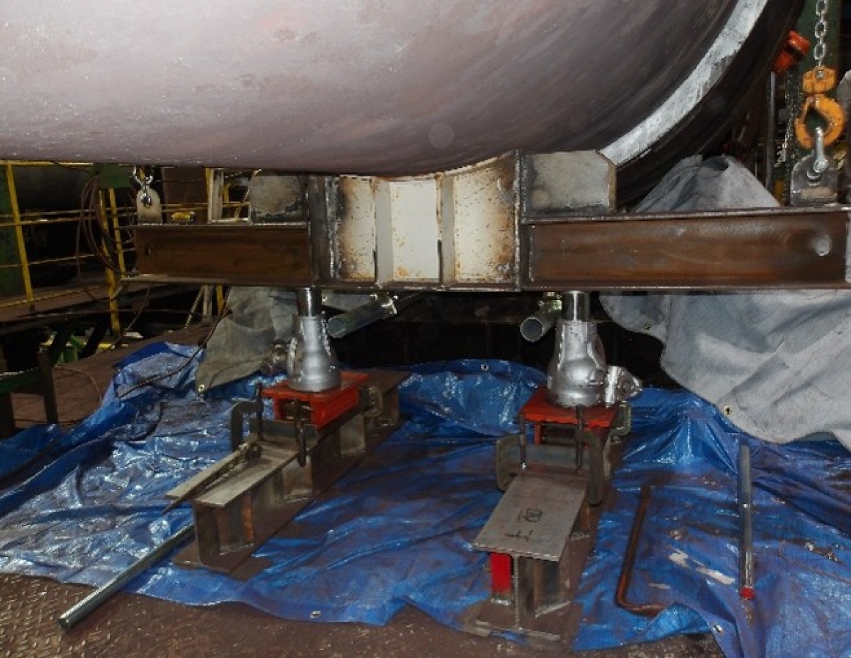 磁性体材料焼成用ロータリーキルン 中間切替工事 経年劣化により本体の肉厚が乏しくなったロータリーキルンに対し、本体の中間部分を切断・撤去し、新しい本体と部分的に入れ替え、溶接にて再接続する工事を行いました。